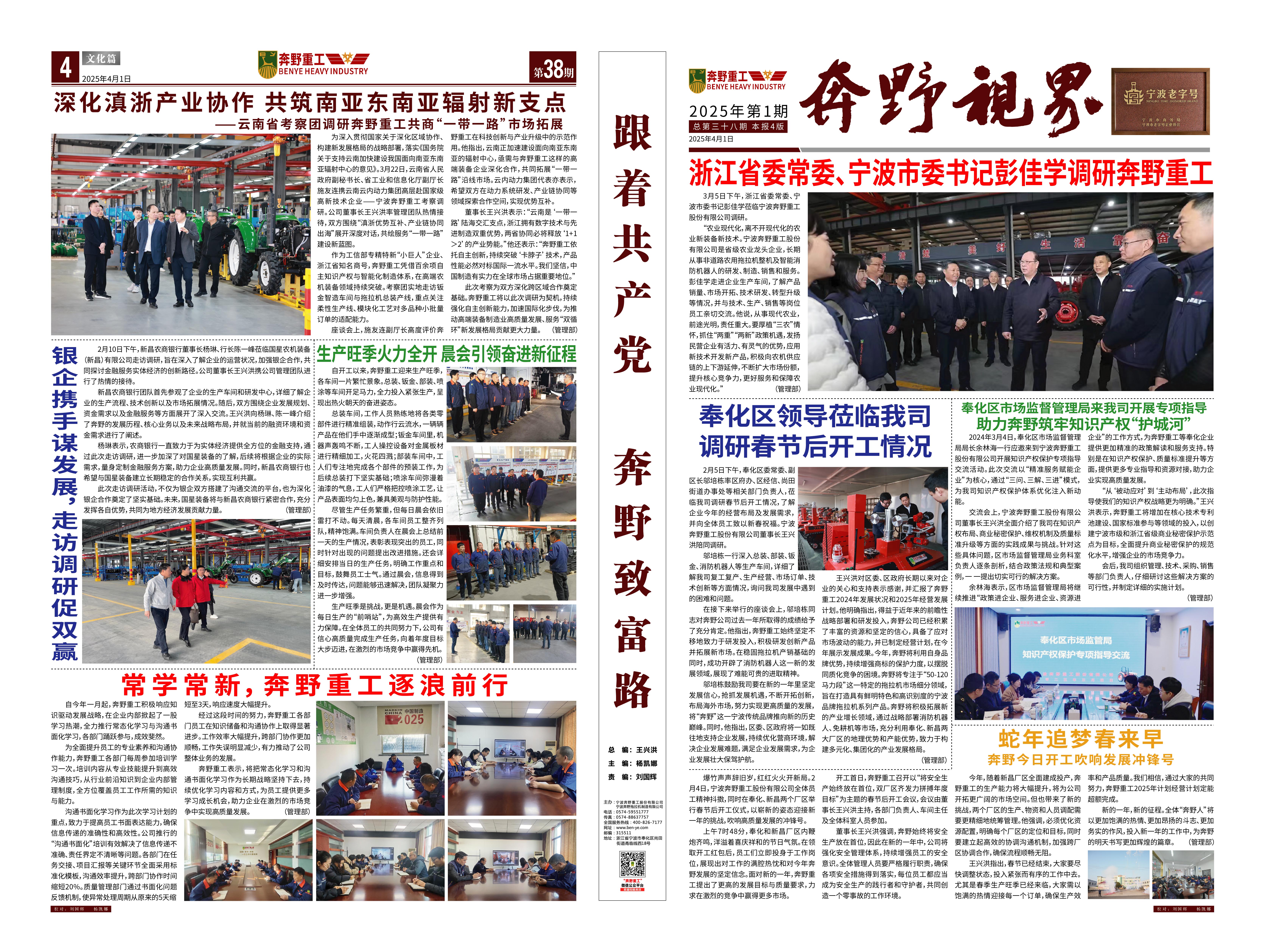 是一家非道路用農用拖拉機整機及部件設備研發、制造、銷售、服務為一體的涉農科研型生產企業,專業生產寧波型奔野系列拖拉機,是國家高新技術企業、工信部專精特新“小巨人”企業、浙江省知名商號,寧波市級農業龍頭企業、脫貧攻堅-產業合作樣板企業、鄉村振興先進集體,在寧波、新昌、吉林等地均設有生產基地,占地150多畝。公司現有技術骨干30多人,零部件自制化水平達到30%以上。公司目前擁有發明專利10余項,實用新型專利、外觀專利、版權近50項,擁有自主的知識產權保護品牌。公司所處的農業農機領域是國家重點關注和保障的、關乎國計民生的領域,得到國家和地方政府的大力支持,行業發展勢頭良好。